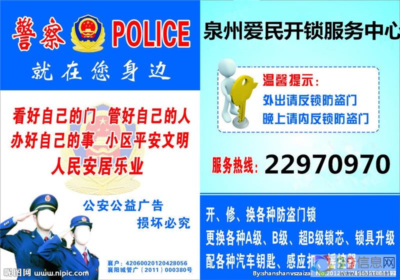 本公司主要提供优质,快捷,安全的,应急开.锁,修锁,换锁,换锁芯,开保险柜,开汽车锁,匹配汽车原厂钥匙;安装维修:电动门,可视门铃,门禁,楼宇对讲,智能电子锁,密码锁,指纹锁,服务所有服务范围内到达现场时间30分钟,全市最快!最好!信誉最高! 真诚期待您的来电99xinxi.net