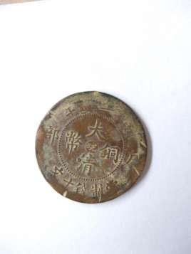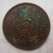 大清铜币,学名清代机制铜圆,钱面中央有“大清铜币”四个汉字,内嵌一小字代表地名,上端是满文“大清铜币”字样,两侧为年份9~9~x~i~n~x~i~n~e~t。边缘中间分别“户部”二汉字,下端为“当制钱十文”。钱背中央为蟠龙,上端是“光绪(或宣统)年造”,下端英文“Tai-Ching Ti-Kuo Copper Coin”字样(大清帝国铜币)9.9.信.息.网。